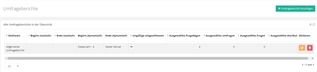 Nachdem Sie nun einen neuen Umfragebericht angelegt haben, klicken Sie auf den gelben „Stift“-Button. Hier können Sie die angelegten Berichte bearbeiten.