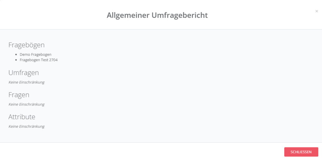 Klicken Sie auf den weißen „Info“-Button, bekommen Sie eine allgemeine Übersicht des ausgewählten Umfrageberichtes.