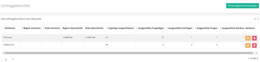 Hier lassen sich Umfrageberichte hinzufügen, bearbeiten und löschen.