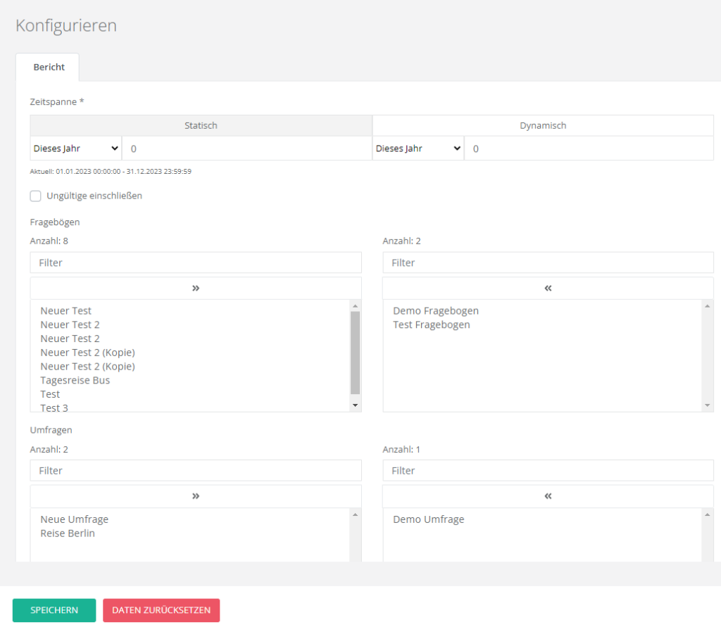 3. Unter Fragebögen, werden nun links im Feld alle Bögen aufgelistet, die in der ausgewählten Zeitspanne, beantwortet wurden. Diese kann man einschränken, indem man die gewünschten Fragebögen nach rechts in das Feld filtert. Ein einfacher Klick auf einen Fragebogen genügt, um den Fragebogen nach rechts zu verschieben. Klickt man auf den Doppelpfeil, der über allen Fragebögen steht, werden alle Fragebögen nach rechts verschoben. Es muss mindesten ein Fragebogen ausgewählt werden, ansonsten bedeutet dies keine Einschränkung. Anschließend können Sie hierzu entsprechend nach den Umfragen, Fragen und Attribute filtern. Abschließend klicken Sie auf den grünen „SPEICHERN“-Button.