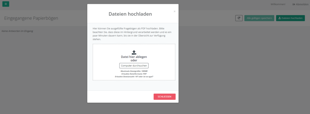 Mit der Funktion „Alle gültigen speichern“ werden aus den gültigen Papierbögen Antwortbögen erstellt. Freitextfelder werden dabei – wie gesagt – nur als Bilder übertragen.