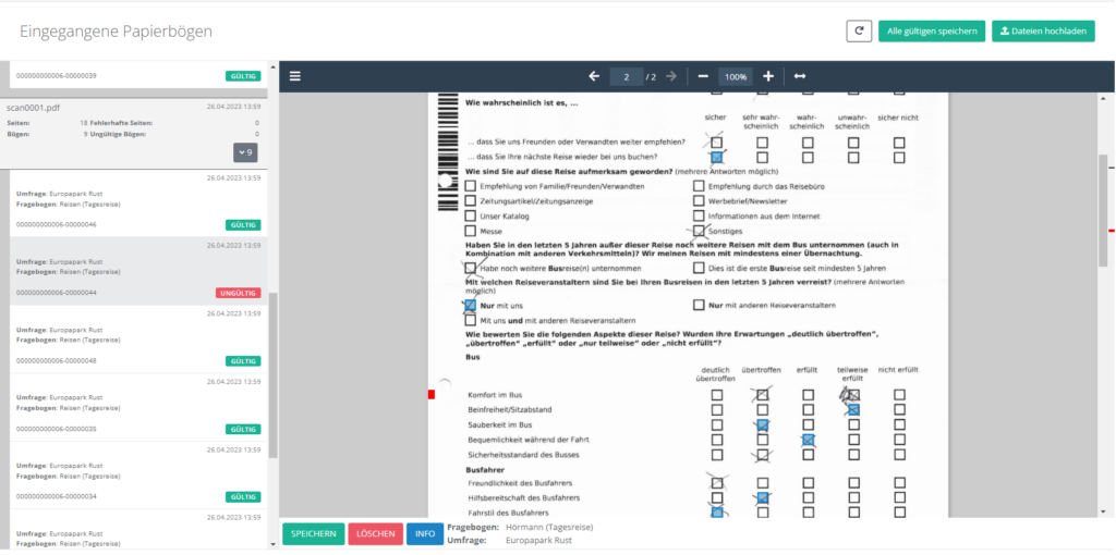 Nicht erkannte Umfragebögen werden als „UNGÜLTIG“ gekennzeichnet. Im Umfragebogen werden die ungültigen Antworten am Rand des Bogens „rot“ gekennzeichnet. Diese kann man manuell korrigieren.