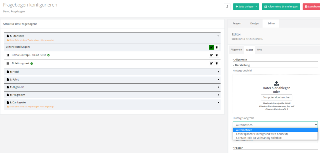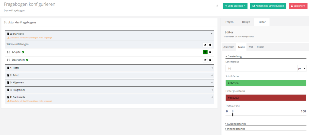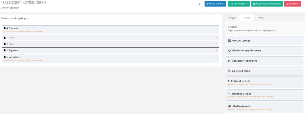 Achtung: Das Anlegen von der Startseite sowie von der Danke-Seite ist bei Papier-Umfragen nicht möglich.
