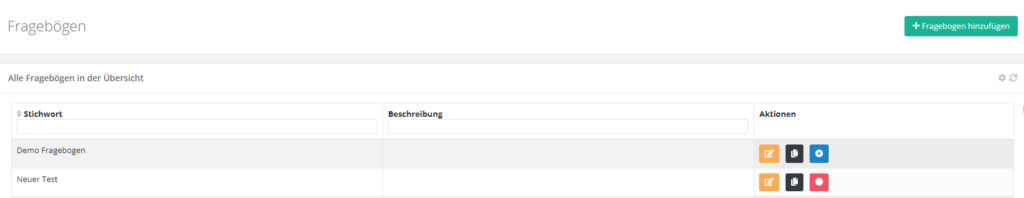 Sobald Ihr Fragebogen fertig gestellt ist, müssen Sie ihn aktivieren. Das machen Sie indem Sie auf den roten Button am Ende der Zeile klicken. Der Button wird blau und der Fragebogen ist somit aktiviert.