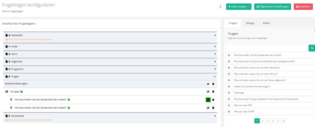 Unter „Fragen“ können Sie die gewünschten Fragen, die Sie vorab im Fragenpool hinterlegt haben, auf die Fragenseite nach links ziehen und anschließend wie auf der Start- und Dankeseite bearbeiten.