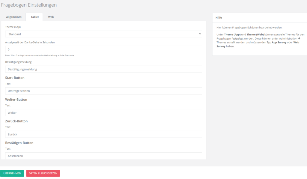 Unter „Tablet“ können Sie eine Bestätigungsmeldung einfügen. Diese wird angezeigt, nachdem man die Tablet-Umfrage abgeschickt hat.