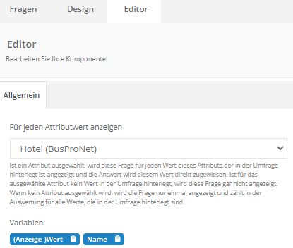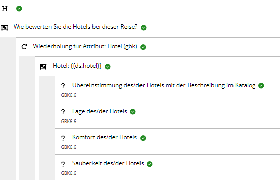 Es gibt Reisen, bei denen die Gäste in verschiedenen Hotels oder mit mehreren Busfahrern etc. reisen. Busfahrer, Hotels, Reiseleiter etc. werden als Attribute im System geführt und über die Datenquellen befüllt. Mit der Iteration ist es z.B. möglich, mehrere Busfahrer namentlich abzufragen. Zunächst wird die Frage als Gruppierung gestellt – verschiedene Punkte z.B. Sauberkeit, Lage, Ausstattung eines Hotels fallen unter die Gruppierungsfrage – Wie bewerten Sie das Hotel.
