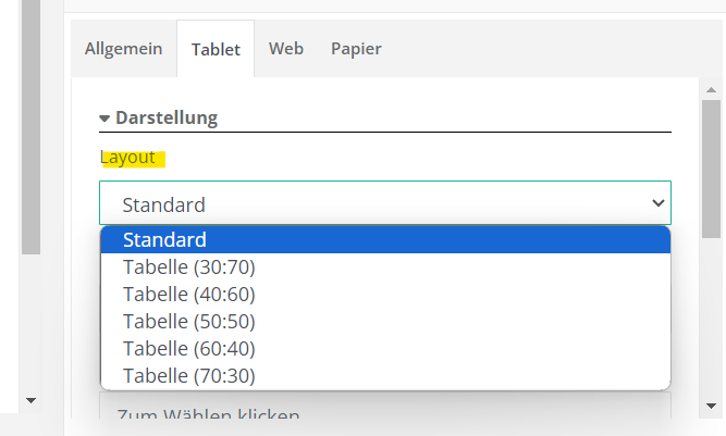 Wenn Sie das Design-Element „Gruppierung“ ausgewählt haben, können Sie auch dieses Element bearbeiten. Bei der Gruppierung kann das Layout angepasst werden. Normalerweise steht das Layout auf Standard. Wenn man eine platzsparende Variante wählen möchte, muss das Layout angepasst werden auf eine Tabellenbreite, die genutzt werden soll. Zusätzlich können Farben und die Schriftgröße der Gruppierungsüberschrift verändert werden.